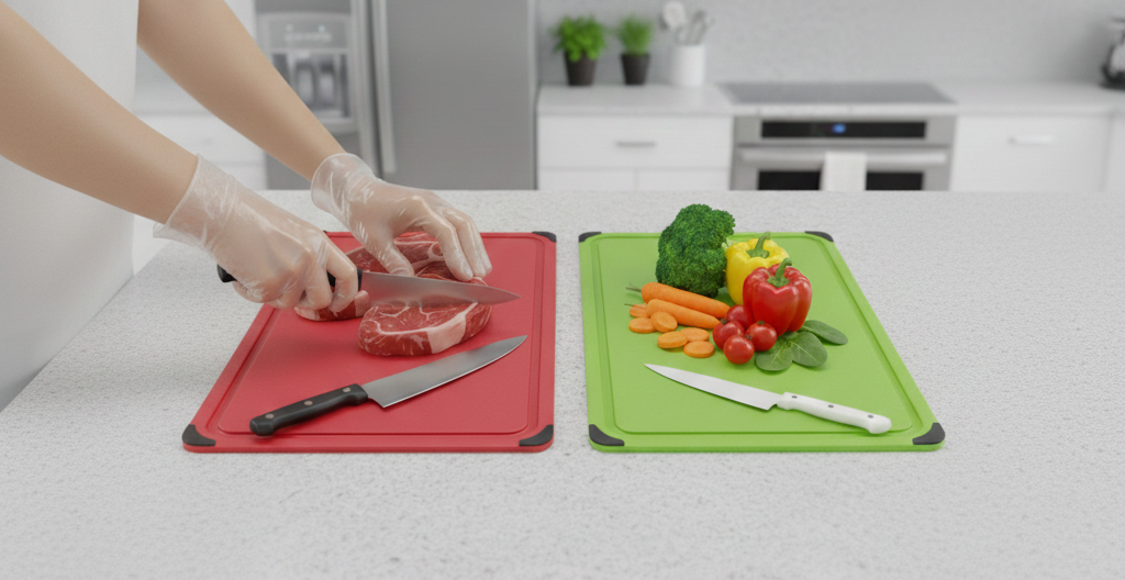 • Gunakan Kode Warna (Color Coding): Pisahkan talenan dan pisau. Contoh umum: Merah untuk daging mentah, Hijau untuk sayuran, Biru untuk seafood, dan Putih untuk makanan matang.